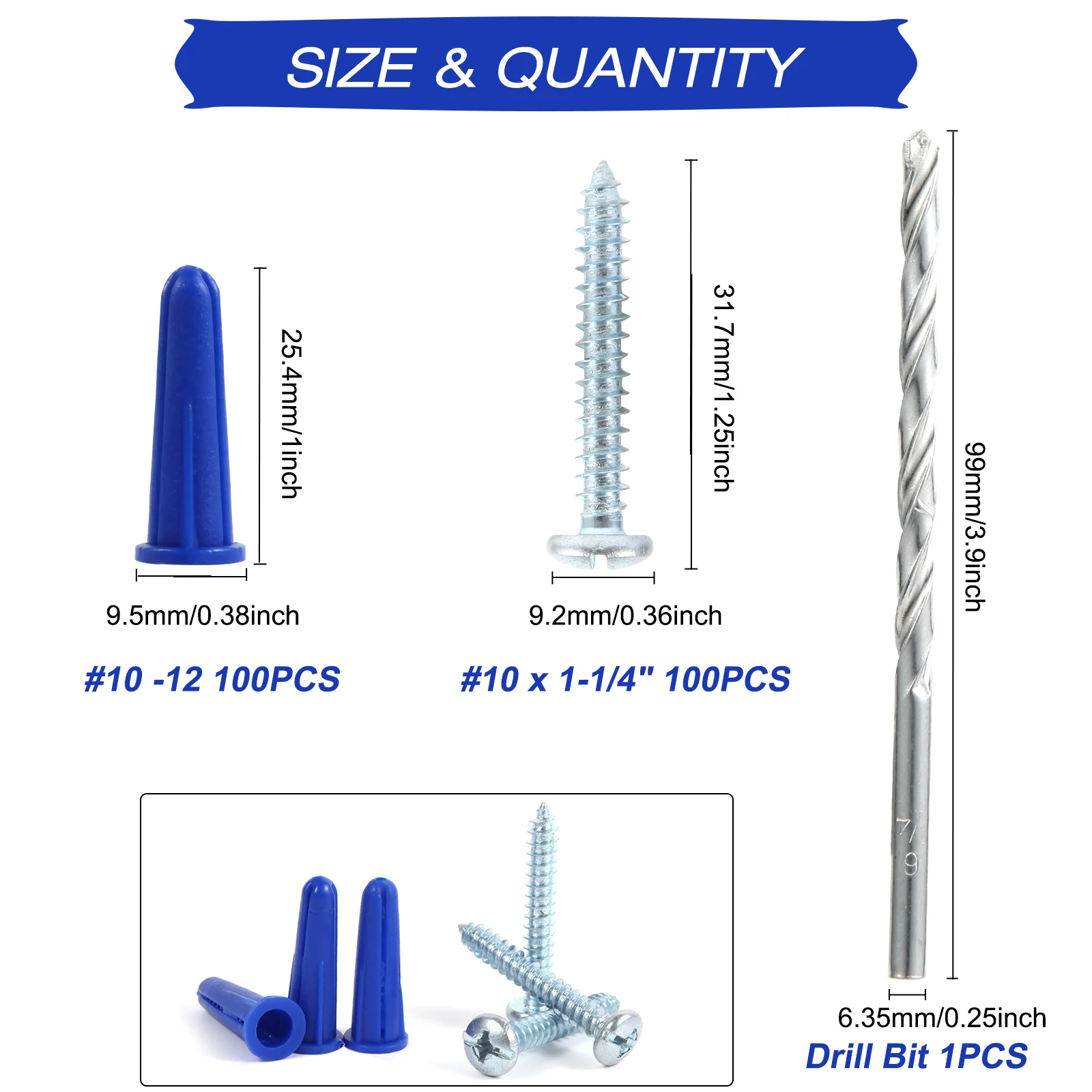 201PC Anchor&Screw Assortment SIZE&QUANTITY #10 -12 100PCSAnchor #10 x 1-1/4" 100PCSScrew Drill Bit 1PCS |