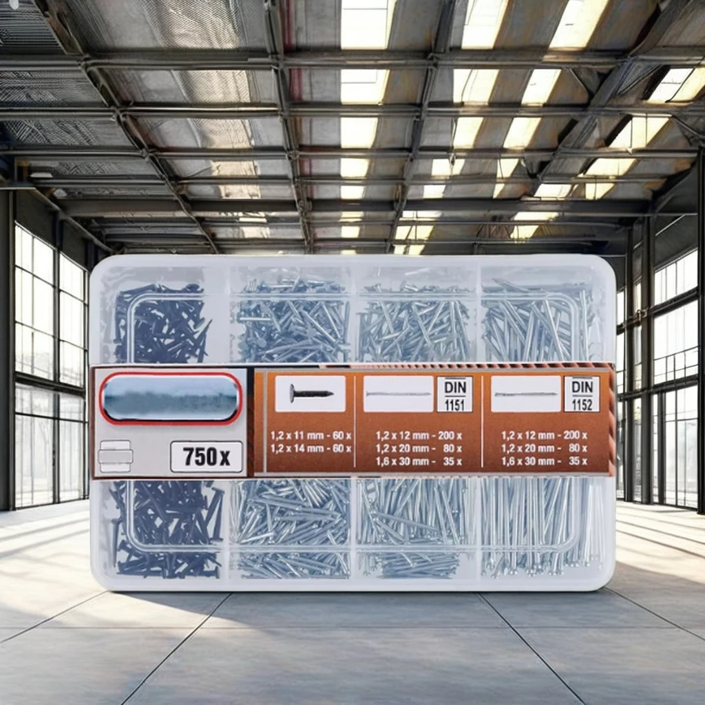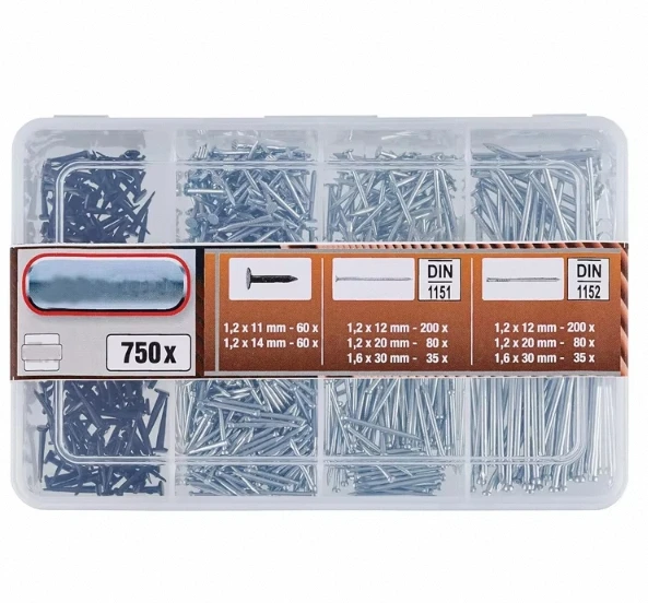 1. Bộ đinh/đinh ghim và đinh tán 750 chi tiết: Bộ đinh/đinh ghim và đinh tán 750 chi tiết này mang đến giải pháp toàn diện cho nhiều nhu cầu cố định khác nhau. Với bộ sưu tập phong phú gồm 750 chiếc đinh và đinh ghim với các độ dài, kích cỡ và màu sắc khác nhau, sản phẩm rất phù hợp cho nhiều ứng dụng như mộc, bọc nệm, thủ công mỹ nghệ và các dự án thủ công.